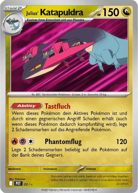 Wenn dieses Pokémon dein Aktives Pokémon ist und durch einen gegnerischen Angriff Schaden erhält (auch wenn dieses Pokémon dadurch kampfunfähig wird), lege 2 Schadensmarken auf das Angreifende Pokémon.Phantomflug • 120+