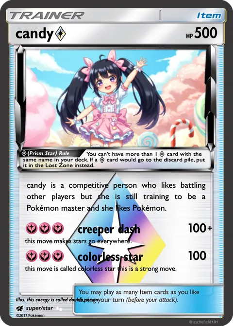 candy is a competitive person who likes battling other players but she is still training to be a Pokémon master and she likes Pokémon.