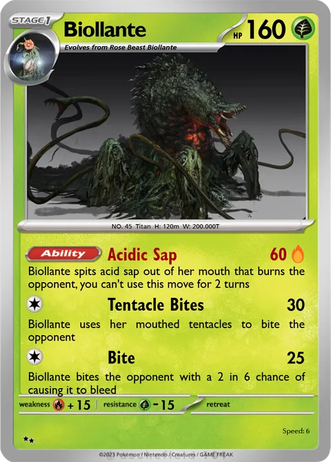 Biollante spits acid sap out of her mouth that burns the opponent, you can't use this move for 2 turnsTentacle Bites • 30