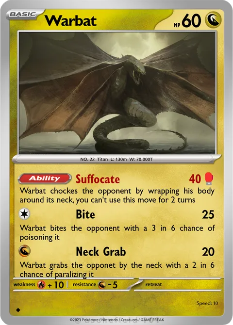Warbat chockes the opponent by wrapping his body around its neck, you can't use this move for 2 turnsBite • 25