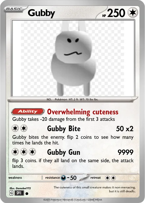 Gubby bites the enemy. flip 2 coins to see how many times he lands the hit.