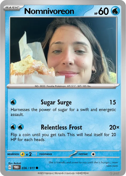 NO. 0033 Foodie Pokémon HT: 5'1" WT: 105 lbs.illus. Beckett#036/911She is friendly and sweet to you until she is hungry... nom nom nomCreated by @gbeckett on 29 December 2023