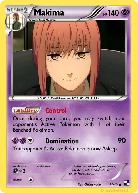 NO. 0011 Devil Pokémon HT: 5’ 6” WT: 119 lbs.illus. Chainsaw Man#11/25With overwhelming authority, she dominates those who fall under her control.Created by @heartnblade on 16 March 2026, last edited on 20 March 2026Includes assets by Creatures Inc.