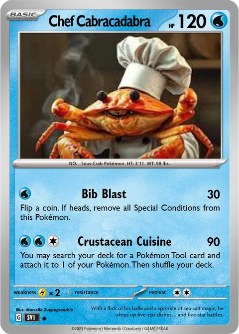NO. Sous-Crab Pokémon HT: 3'11 WT: 98 lbs.illus. Marcello ZuppagranchioWith a flick of his ladle and a sprinkle of sea-salt magic, he whips up five-star dishes… and five-star battles.Created by @hectorinspace on 11 June 2025
