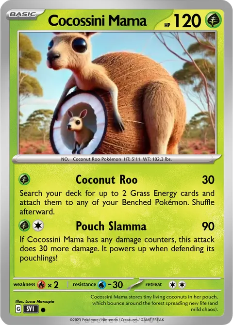 If Cocossini Mama has any damage counters, this attack does 30 more damage. It powers up when defending its pouchlings!