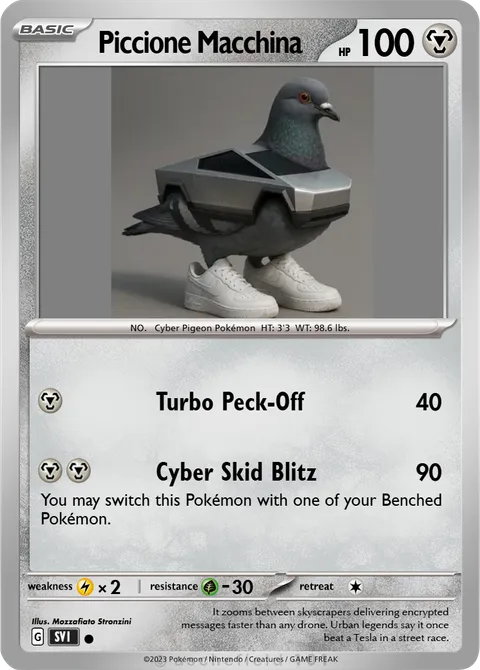 NO. Cyber Pigeon Pokémon HT: 3'3 WT: 98.6 lbs.illus. Mozzafiato StronziniIt zooms between skyscrapers delivering encrypted messages faster than any drone. Urban legends say it once beat a Tesla in a street race.Created by @hectorinspace on 09 June 2025