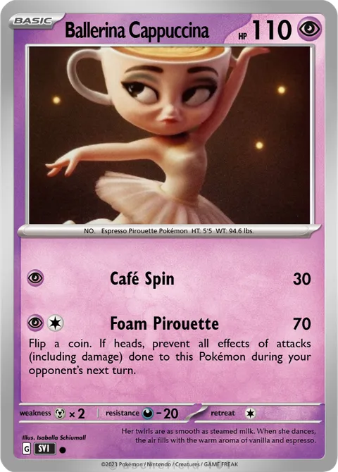 NO. Espresso Pirouette Pokémon HT: 5'5 WT: 94.6 lbs.illus. Isabella SchiumallHer twirls are as smooth as steamed milk. When she dances, the air fills with the warm aroma of vanilla and espresso.Created by @hectorinspace on 01 July 2025
