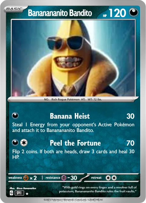 NO. Rich Rogue Pokémon HT: WT: 72 lbs.illus. Ricco Bananafox“With gold rings on every finger and a revolver full of potassium, Bananananito Bandito rules the fruit vaults.”Created by @hectorinspace on 10 June 2025