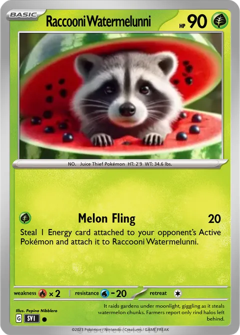 Steal 1 Energy card attached to your opponent’s Active Pokémon and attach it to Raccooni Watermelunni.