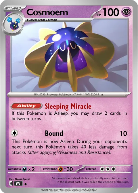 This Pokémon is now Asleep. During your opponent’s next turn, this Pokémon takes 40 less damage from attacks (after applying Weakness and Resistance).