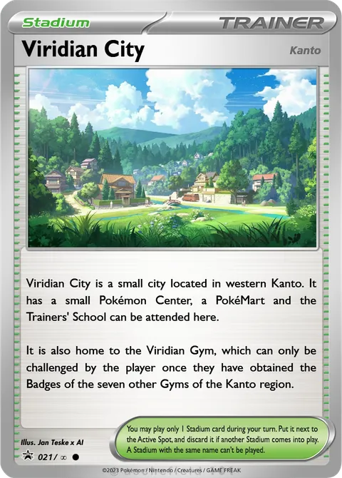 Viridian City is a small city located in western Kanto. It has a small Pokémon Center, a PokéMart and the Trainers' School can be attended here.