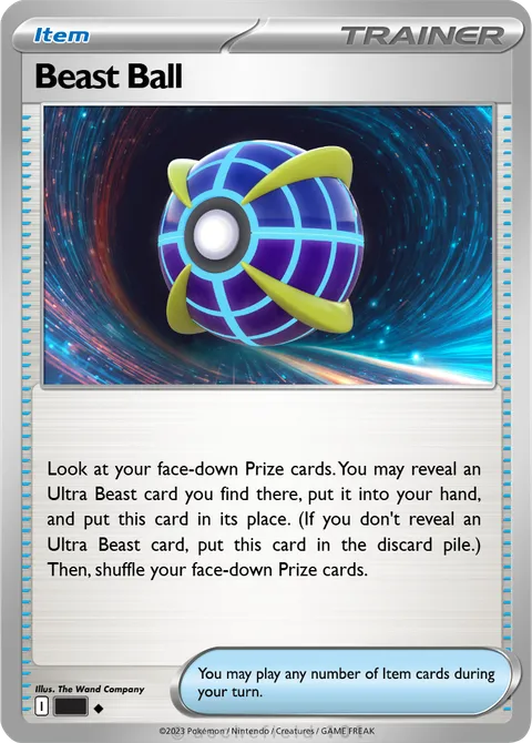 Look at your face-down Prize cards. You may reveal an Ultra Beast card you find there, put it into your hand, and put this card in its place. (If you don't reveal an Ultra Beast card, put this card in the discard pile.) Then, shuffle your face-down Prize cards.