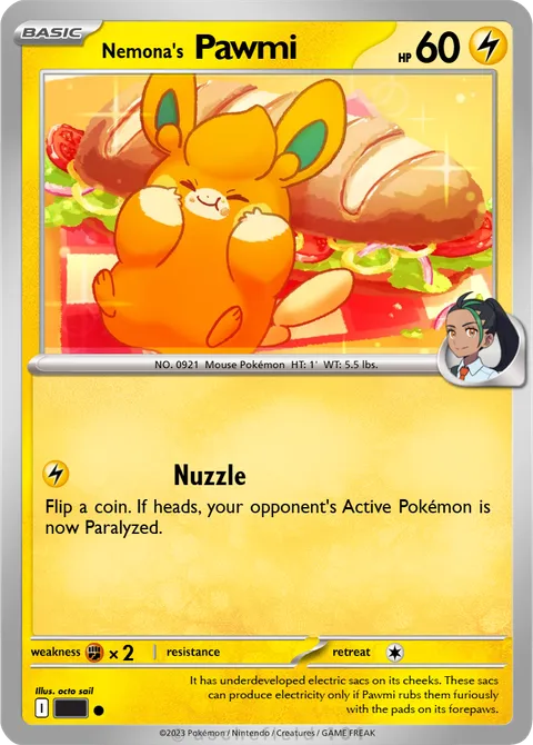 NO. 0921 Mouse Pokémon HT: 1' WT: 5.5 lbs.illus. octo sailIt has underdeveloped electric sacs on its cheeks. These sacs can produce electricity only if Pawmi rubs them furiously with the pads on its forepaws.Created by @legoboy_20 on 20 March 2025