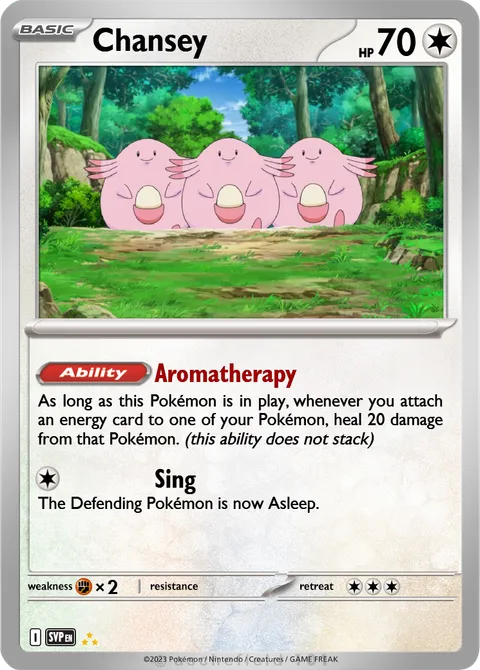 As long as this Pokémon is in play, whenever you attach an energy card to one of your Pokémon, heal 20 damage from that Pokémon. (this ability does not stack)Sing