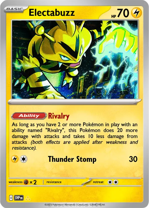 As long as you have 2 or more Pokémon in play with an ability named "Rivalry", this Pokémon does 20 more damage with attacks and takes 10 less damage from attacks (both effects are applied after weakness and resistance).Thunder Stomp • 30