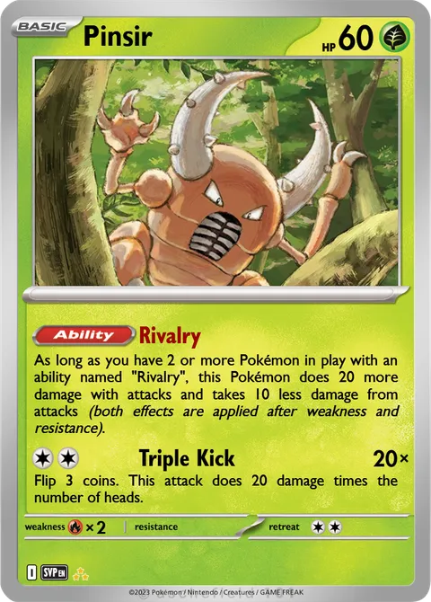 As long as you have 2 or more Pokémon in play with an ability named "Rivalry", this Pokémon does 20 more damage with attacks and takes 10 less damage from attacks (both effects are applied after weakness and resistance).Triple Kick • 20×