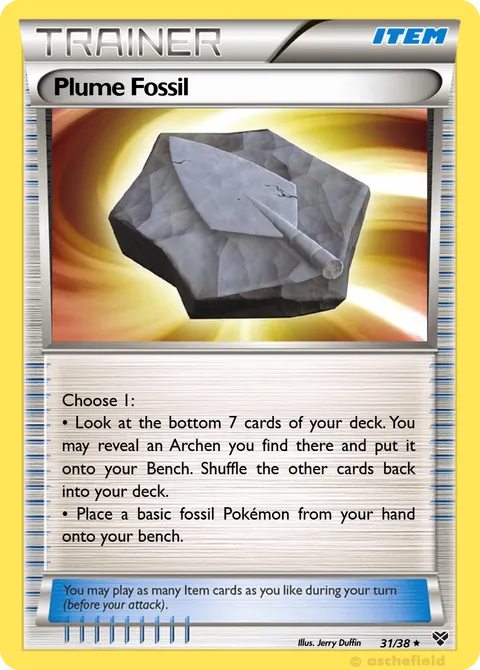 Choose 1: • Look at the bottom 7 cards of your deck. You may reveal an Archen you find there and put it onto your Bench. Shuffle the other cards back into your deck. • Place a basic fossil Pokémon from your hand onto your bench.