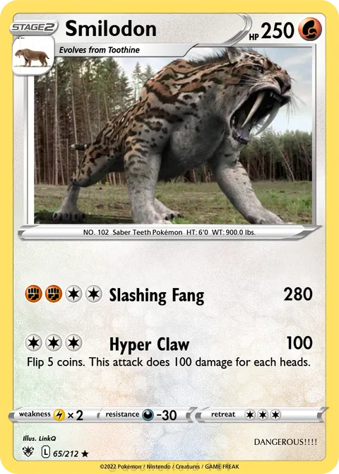 NO. 102 Saber Teeth Pokémon HT: 6'0 WT: 900.0 lbs.illus. LinkQ#65/212DANGEROUS!!!!Created by @link16 on 21 March 2026Includes assets by Creatures Inc., Xtuart