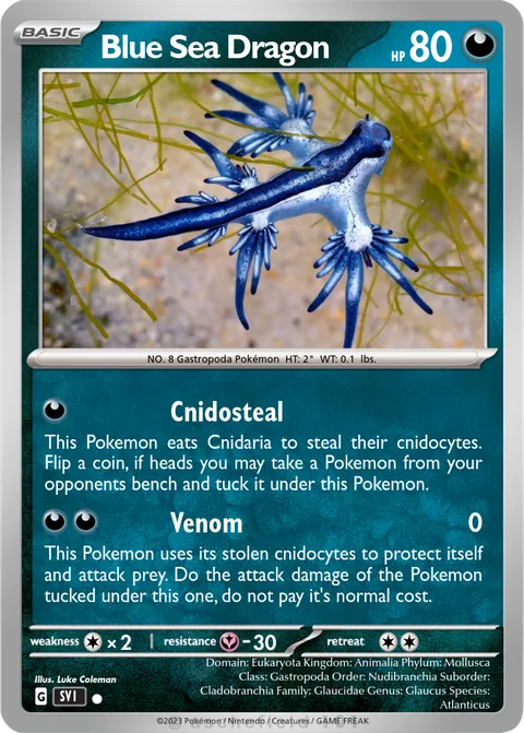 This Pokemon eats Cnidaria to steal their cnidocytes. Flip a coin, if heads you may take a Pokemon from your opponents bench and tuck it under this Pokemon.