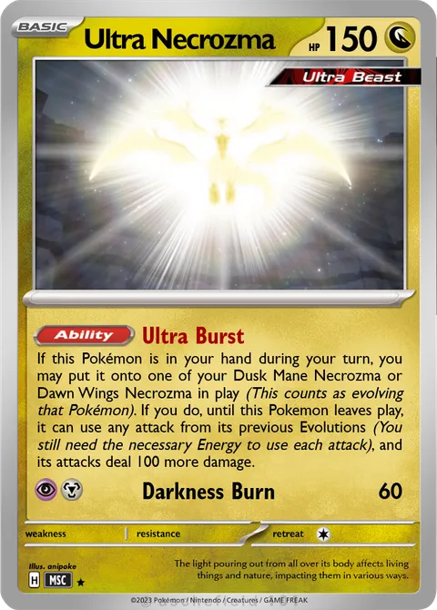 If this Pokémon is in your hand during your turn, you may put it onto one of your Dusk Mane Necrozma or Dawn Wings Necrozma in play (This counts as evolving that Pokémon). If you do, until this Pokemon leaves play, it can use any attack from its previous Evolutions (You still need the necessary Energy to use each attack), and its attacks deal 100 more damage.Darkness Burn • 60