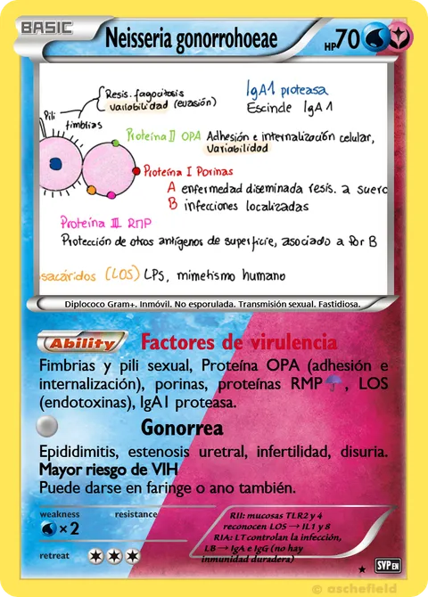 Fimbrias y pili sexual, Proteína OPA (adhesión e internalización), porinas, proteínas RMP☂️, LOS (endotoxinas), IgA1 proteasa.Gonorrea