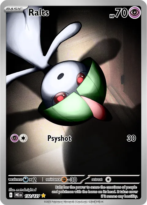 illus. metroknighted#132/127Ralts has the power to sense the emotions of people and pokémon with the horns on its head. It takes cover if it senses any hostility.Created by @metroknighted on 27 March 2026, last edited on 28 March 2026Includes assets by Creatures Inc.