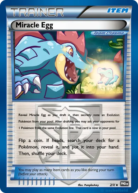 Reveal Miracle Egg as you draft it, then secretly note an Evolution Pokémon from your pool. After drafting, you may ask your opponents for 1 Pokémon from the same Evolution line. That card is now in your pool. Flip a coin. If heads, search your deck for a Pokémon, reveal it, and put it into your hand. Then, shuffle your deck.