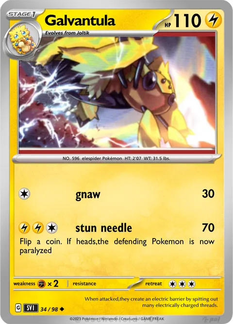 NO. 596 elespider Pokémon HT: 2'07 WT: 31.5 lbs.#34/98When attacked,they create an electric barrier by spitting out many electrically charged threads.Created by @pand0606_123 on 13 January 2024