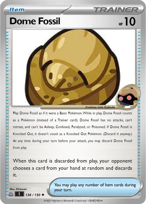 Play Dome Fossil as if it were a Basic Pokémon. While in play, Dome Fossil counts as a Pokémon (instead of a Trainer card). Dome Fossil has no attacks, can't retreat, and can't be Asleep, Confused, Paralyzed, or Poisoned. If Dome Fossil is Knocked Out, it doesn't count as a Knocked Out Pokémon. (Discard it anyway.) At any time during your turn before your attack, you may discard Dome Fossil from play. When this card is discarded from play, your opponent chooses a card from your hand at random and discards it.