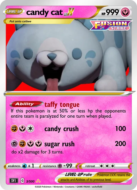 If this pokemon is at 50% or less hp the opponents entire team is paralyzed for one turn when played.candy crush • 100