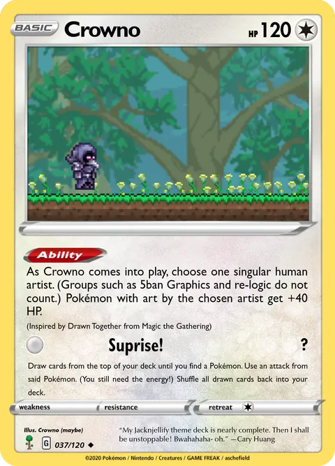 As Crowno comes into play, choose one singular human artist. (Groups such as 5ban Graphics and re-logic do not count.) Pokémon with art by the chosen artist get +40 HP. (Inspired by Drawn Together from Magic the Gathering)
