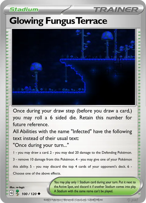 Once during your draw step (before you draw a card,) you may roll a 6 sided die. Retain this number for future reference. All Abilities with the name "Infected" have the following text instead of their usual text: "Once during your turn..." 1 - you may draw a card. 2 - you may deal 20 damage to the Defending Pokémon. 3 - remove 10 damage from this Pokémon. 4 - you may give one of your Pokémon this ability. 5 - you may discard the top 4 cards of your opponent's deck. 6 - Choose one of the above effects.