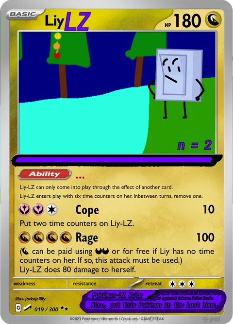 Liy-LZ can only come into play through the effect of another card. Liy-LZ enters play with six time counters on her. Inbetween turns, remove one.Cope • 10