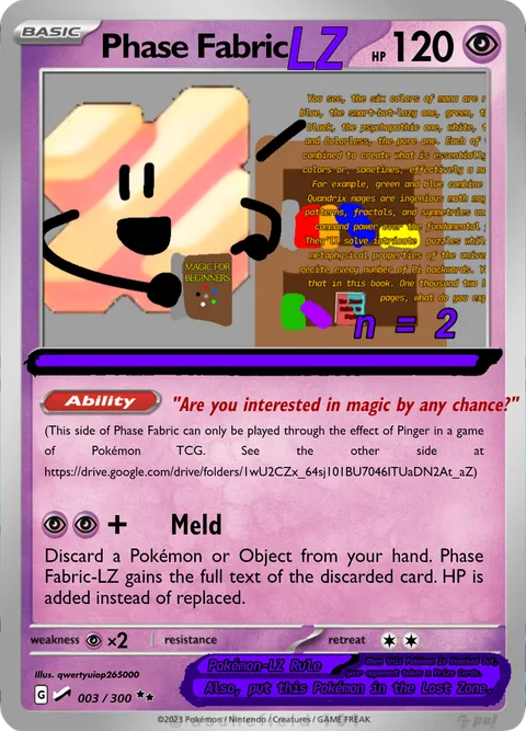 (This side of Phase Fabric can only be played through the effect of Pinger in a game of Pokémon TCG. See the other side at https://drive.google.com/drive/folders/1wU2CZx_64sj101BU7046ITUaDN2At_aZ)Meld