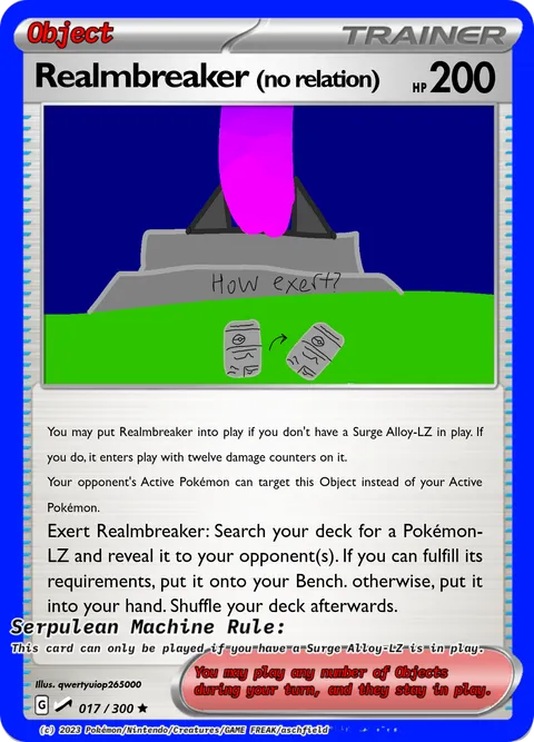 You may put Realmbreaker into play if you don't have a Surge Alloy-LZ in play. If you do, it enters play with twelve damage counters on it. Your opponent's Active Pokémon can target this Object instead of your Active Pokémon. Exert Realmbreaker: Search your deck for a Pokémon-LZ and reveal it to your opponent(s). If you can fulfill its requirements, put it onto your Bench. otherwise, put it into your hand. Shuffle your deck afterwards.