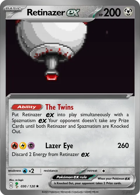 Put Retinazer ex into play simultaneously with a Spazmatism ex. Your opponent doesn't take any Prize Cards until both Retinazer and Spazmatism are Knocked Out.