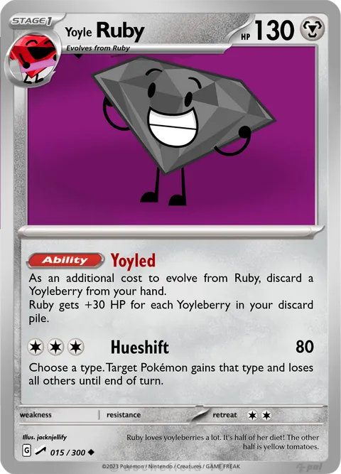 As an additional cost to evolve from Ruby, discard a Yoyleberry from your hand. Ruby gets +30 HP for each Yoyleberry in your discard pile.Hueshift • 80