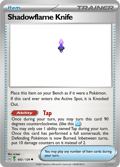Once during your turn, you may turn this card 90 degrees counterclockwise. (like this 🔄) You may only use 1 ability named Tap during your turn. Once this card has performed a full somersault, the Defending Pokémon is now Burned. Inbetween turns, put 10 damage counters on it instead of 2.