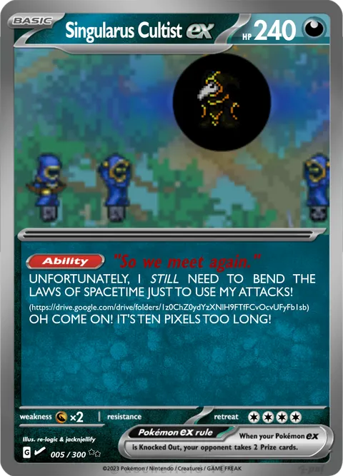 UNFORTUNATELY, I STILL NEED TO BEND THE LAWS OF SPACETIME JUST TO USE MY ATTACKS! (https://drive.google.com/drive/folders/1z0ChZ0ydYzXNlH9FTfFCvOcvUFyFb1sb) OH COME ON! IT'S TEN PIXELS TOO LONG!Weakness: