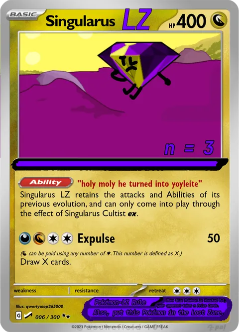 Singularus LZ retains the attacks and Abilities of its previous evolution, and can only come into play through the effect of Singularus Cultist e.Expulse • 50