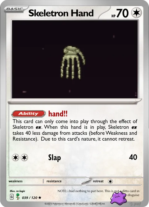 This card can only come into play through the effect of Skeletron e. When this hand is in play, Skeletron e takes 40 less damage from attacks (before Weakness and Resistance). Due to this card's nature, it cannot retreat.Slap • 40