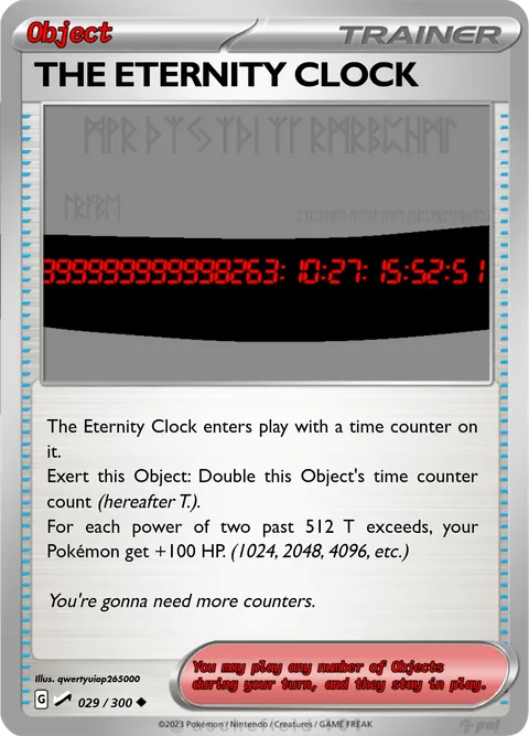The Eternity Clock enters play with a time counter on it. Exert this Object: Double this Object's time counter count (hereafter T.). For each power of two past 512 T exceeds, your Pokémon get +100 HP. (1024, 2048, 4096, etc.) You're gonna need more counters.