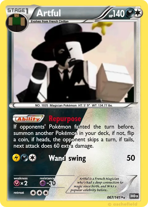 NO. 1035 Magician Pokémon HT: 5' 9" WT: 134.77 lbs.#067/141Artful is a French Magician who's had a deep connection to magic since birth, and WAS a popular celebrity before..Created by @random_cards on 01 January 2026Includes assets by Creatures Inc.