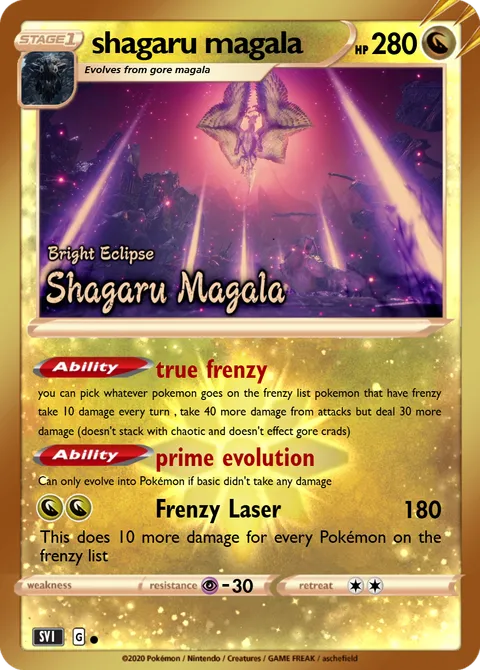 you can pick whatever pokemon goes on the frenzy list pokemon that have frenzy take 10 damage every turn , take 40 more damage from attacks but deal 30 more damage (doesn't stack with chaotic and doesn't effect gore crads)Ability: prime evolution