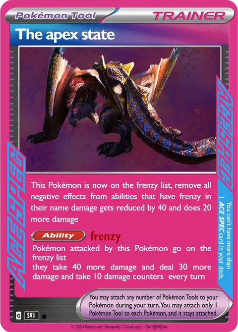 Pokémon attacked by this Pokémon go on the frenzy list they take 40 more damage and deal 30 more damage and take 10 damage counters every turnCreated by @raymikyu on 26 July 2025
