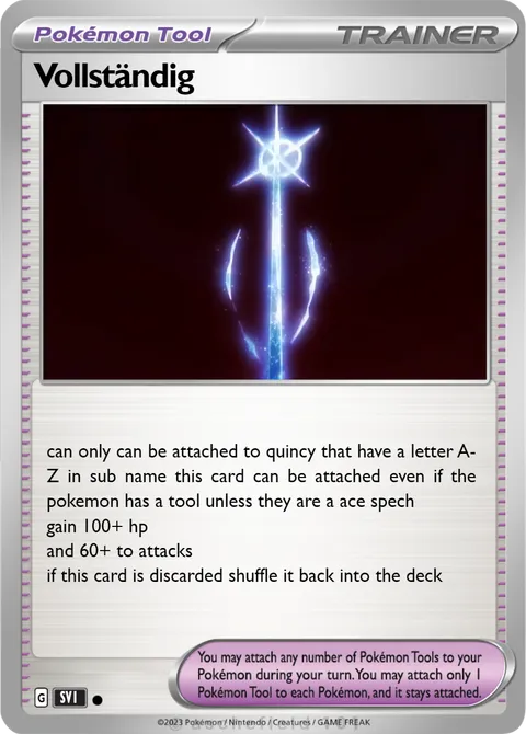 can only can be attached to quincy that have a letter A-Z in sub name this card can be attached even if the pokemon has a tool unless they are a ace spech gain 100+ hp and 60+ to attacks if this card is discarded shuffle it back into the deck