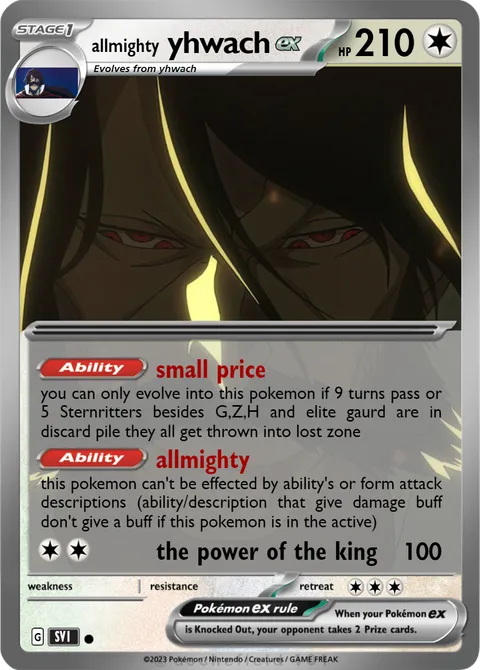 you can only evolve into this pokemon if 9 turns pass or 5 Sternritters besides G,Z,H and elite gaurd are in discard pile they all get thrown into lost zoneAbility: allmighty