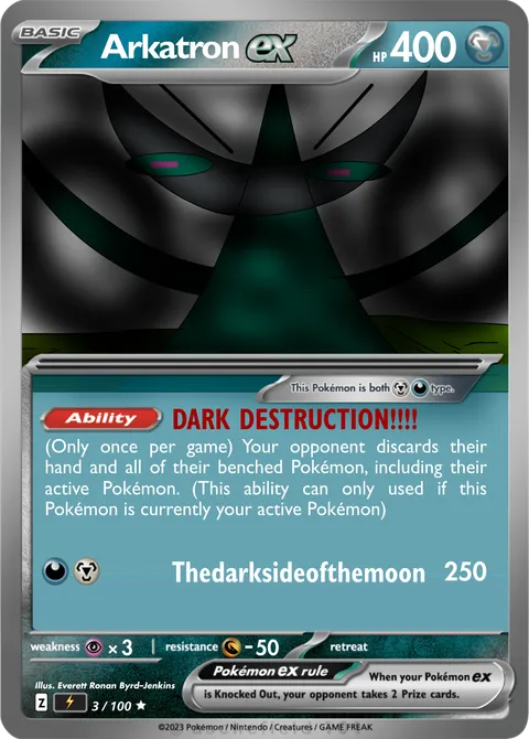 (Only once per game) Your opponent discards their hand and all of their benched Pokémon, including their active Pokémon. (This ability can only used if this Pokémon is currently your active Pokémon)Thedarksideofthemoon • 250