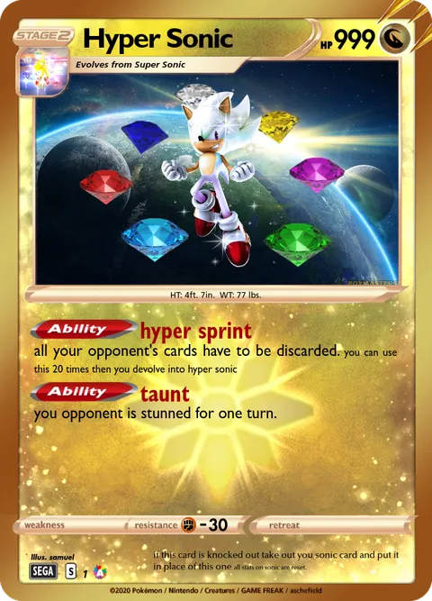 all your opponent's cards have to be discarded. you can use this 20 times then you devolve into hyper sonicAbility: taunt