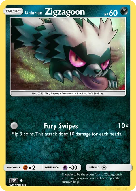 NO. 0263 Tiny Raccoon Pokémon HT: 0.4 m. WT: 38.6 lbs.Thought to be the oldest form of Zigzagoon, it moves in zigzags and wreaks havoc upon its surroundings.